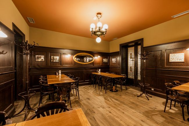 Interiér spojuje prvky tradiční české hospody s moderním designem. Dřevo, měď, teplé světlo a živá atmosféra vytvářejí prostředí, kde se cítí dobře: